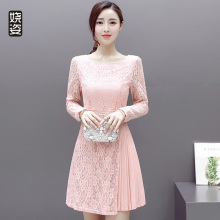 2017春装蕾丝连衣裙女中长款气质修身长袖打底裙拼接雪纺百褶裙潮