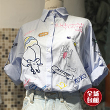 2017春韩国东大门刺绣长袖衬衣宽松显瘦短袖百搭纯棉条纹白衬衫女