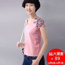 熙世界2017夏新品上衣V领民族风印花短袖棉T恤女192ST042