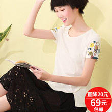 熙世界2017夏季新款棉质V领修身短袖印花T恤民族风上衣女192ST006