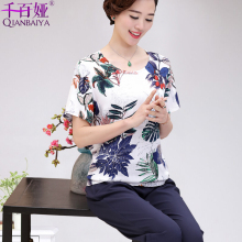 中年女装夏装短袖T恤上衣40-50岁妈妈装棉麻套装两件套修身七分裤