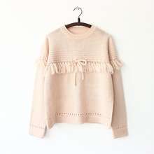 秋冬软妹蝴蝶结绑带抽绳镂空流苏套头针织衫上衣宽松毛衣女
