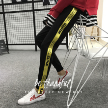 春夏潮流织带一条杠印花收脚修身小脚裤男士青少年时尚运动休闲裤