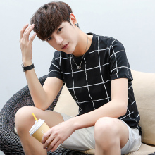 青少年夏季格子短袖男士圆领T恤修身格纹学生打底上衣潮体恤衫