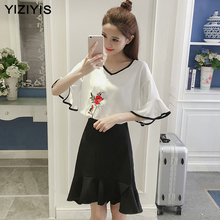 2017夏季时尚雪纺刺绣花朵修身上衣+包臂裙两件套装鱼尾连衣裙女