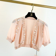 4折清仓〖杰〗品牌折扣秋装雪纺拼接钉珠短开衫针织衫女3B049