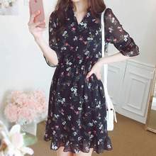 碎花雪纺连衣裙女夏2017新款修身显瘦时尚喇叭袖收腰裙子中长款