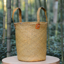 自然而然 全手工编织水海草编杂物收纳筐花瓶套 圆形提手收纳桶