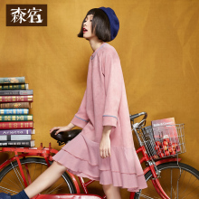 森宿P记号水饺春装女修身复古小清新文艺格子棉麻衬衫连衣裙中裙