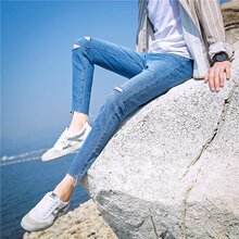 夏季浅色破洞九分牛仔裤男士修身小脚裤青少年学生薄款休闲哈伦裤