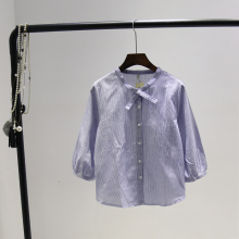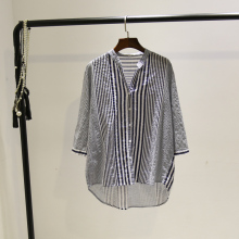 春夏季新品韩版文艺小清新粗细竖条纹7分袖衬衫女宽松休闲棉衬衣