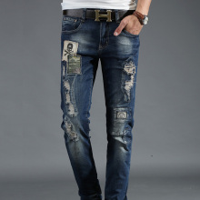 潮流破洞牛仔裤男直筒四季款长裤修身休闲小直脚中腰蓝色刮烂流行