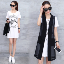 2017夏季韩版中长款短袖T恤网纱后背开叉马甲套装宽松休闲两件套