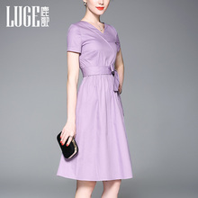 鹿歌紫色连衣裙女夏2017新款时尚收腰系带裙子气质短袖v领a字裙