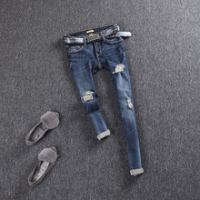 欧洲站2017春秋新款女装时尚百搭修身磨破抓纹水洗小脚牛仔裤