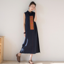 原创民族风女装2017夏棉麻中式复古立领老绣片拼接亚麻无袖连衣裙