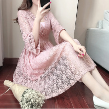 2017春季新款韩版时尚气质中长款修身显瘦中袖蕾丝镂空A字连衣裙