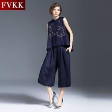 FVKK欧洲站2017夏装新款欧货无袖背心套装女宽腿七分裤绣花连衣裤