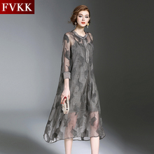 FVKK2017夏装新款真丝欧根纱绣花连衣裙立领七分袖大摆中长裙女装