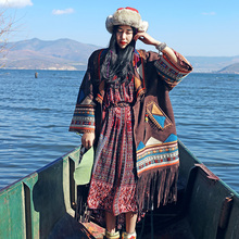 麦叙藏地民族风麂皮绒拼色秋款风衣女2016中长款流苏复古宽松外套