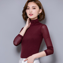 2017春季新款简约纯色打底衫女装长袖高领百搭网纱拼接蕾丝衫上衣