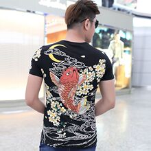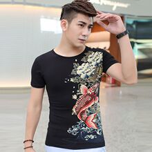 夏季中国风男装短袖上衣鲤鱼纹身图案体恤衫个性印花男士修身t恤
