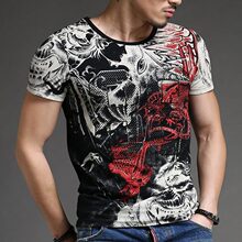 夏季中国风纹身圆领个性打底衫 韩版修身印花半袖紧身男士短袖T恤