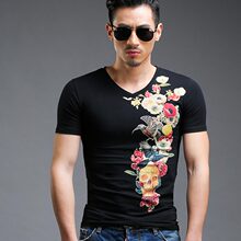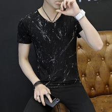 夏装新款韩版时尚修身印花薄款潮流V领短袖T恤男装青年上衣体恤衫