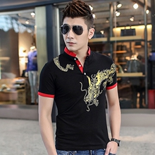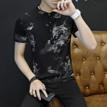 夏季中国风印花男士短袖T恤 龙图案有领上衣服韩版修身立领体恤衫