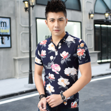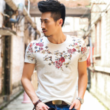 夏装男士短袖T恤韩版时尚修身花卉上衣 圆领印花个性图案体恤衫潮