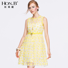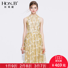 HONB红贝缇春无袖甜美小黄花高腰蕾丝刺绣修身打底连衣裙L51028