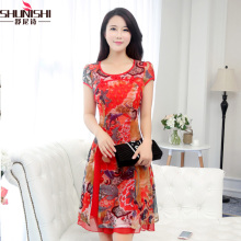 雪纺旗袍连衣裙2017夏季修身显瘦印花中长款A字裙改良复古裙子夏