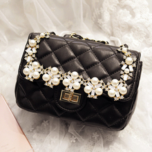 iFashion2017夏新款潮女式菱格纹珍珠镶水钻链条单肩斜挎小方包包