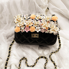 iFashion2017新款夏季时尚纯手工花朵水钻珍珠链条单肩斜挎女包包