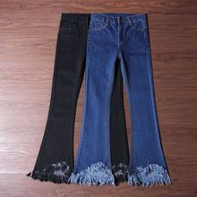 欧美女款微喇叭裤高腰提臀紧身显瘦9分裤流苏毛边阔腿裤牛仔裤潮