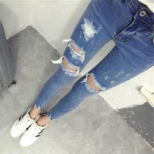 韩版大破洞网袜牛仔裤九分裤女浅蓝色个性磨破显瘦修身小脚铅笔裤