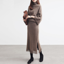 2016秋装女装新款时尚套装女宽松加厚毛衣+开叉流苏针织裙长裙