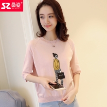 桑姿春季韩版新款圆领卡通印花套头毛衣女五分袖针织衫宽松打底衫