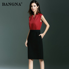 邦娜原创2017夏季新款女装无袖V领背心中裙子时尚拼接修身连衣裙