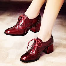 2017春季新款单鞋英伦风女鞋粗跟系带变色漆皮系带深口尖头高跟鞋