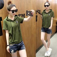 2017夏季新款女士连帽短袖T恤纯棉休闲运动短款上衣宽松显瘦百搭