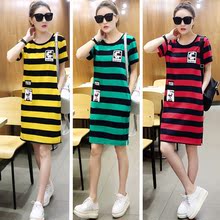 2017短袖T恤女宽松包臀中长款休闲夏季体恤横条纹大码开衩连衣裙