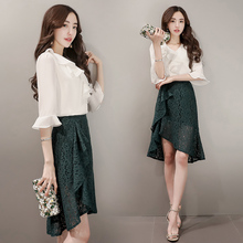 2017春夏新款套装女韩版荷叶袖雪纺上衣蕾丝包臀裙半身裙两件套潮