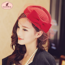 真享韩版小礼帽春夏季蝴蝶结羊毛呢帽女士酒红色贝蕾网纱帽