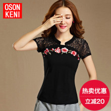 欧尚珂妮2017夏装新品民族立领蕾丝衫 拼接绣花修身短袖T恤女1091