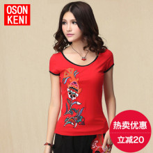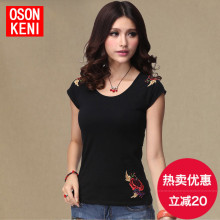 欧尚珂妮2017夏装新款修身刺绣短袖民族风大码上衣短袖T恤女