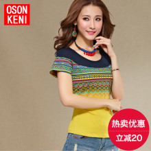 欧尚珂妮2017夏装新款 民族风女装短袖圆领拼接印花t恤棉女修身