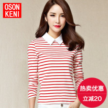 欧尚珂妮2017春装新款假两件条纹POLO领打底衫长袖T恤女