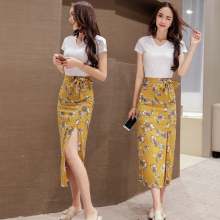 2017年夏季气质修身半身裙潮流套裙 T恤上衣+花色包臀裙两件套