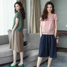 2017年夏季时尚优雅甜美套装短袖纯色圆领上衣套装二件套裙